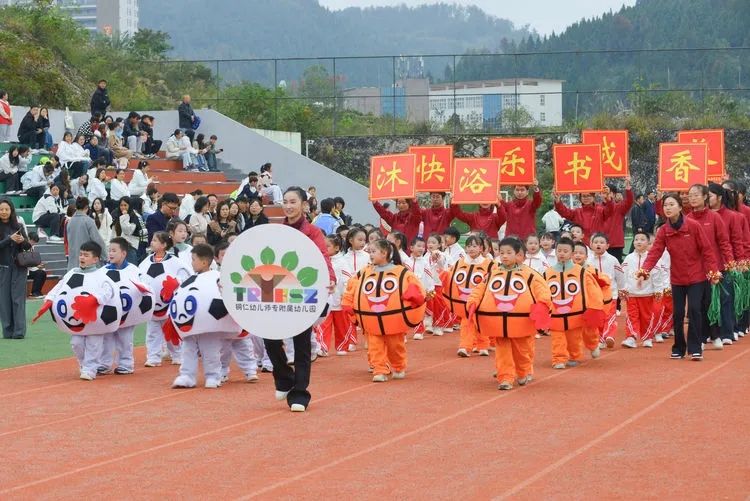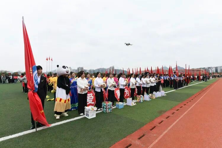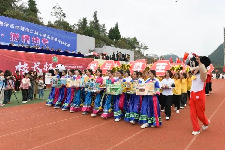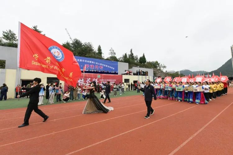 伴随着悠扬的乐曲,国旗方阵、校旗方阵、会旗方阵、彩旗方阵、附属幼儿园方阵、各系部方阵、铜仁市旅游学校方阵等列队走过主席台前。