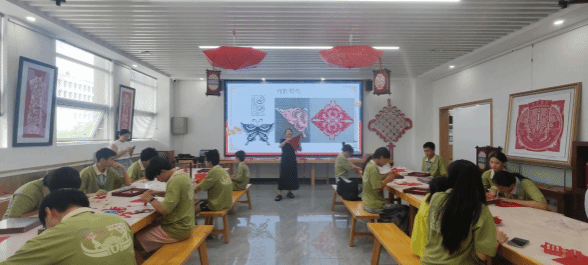 在剪纸工作坊,我校非遗中心负责人杨海燕老师向华裔青少年们介绍中国剪纸的发展历史、艺术特色、创作技法等,大家听得津津有味,纷纷感叹一把小小的剪刀在百转千回间能创作出如此惊艳、精美的作品,为古人先贤们丰富的想象力和深远的智慧点赞。
