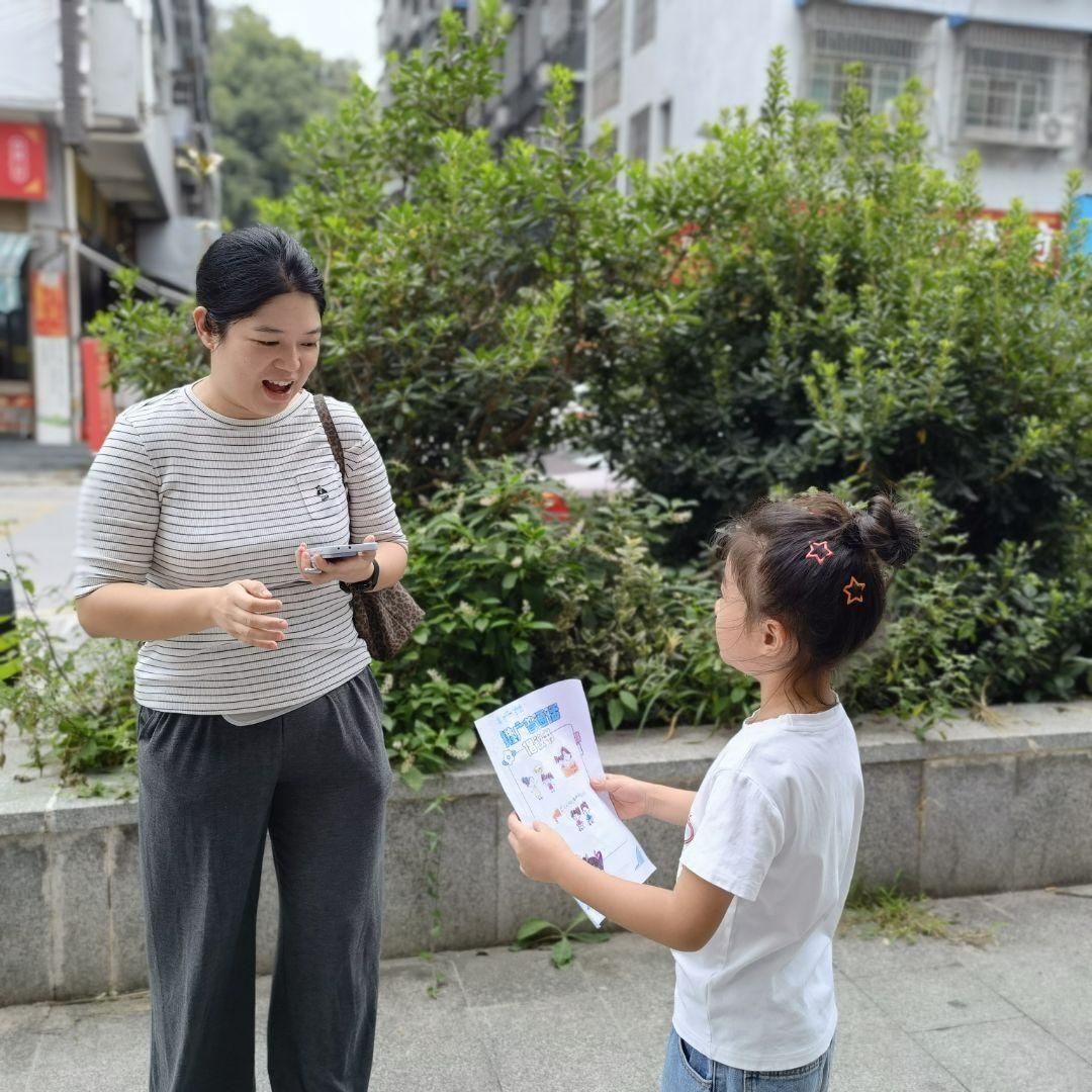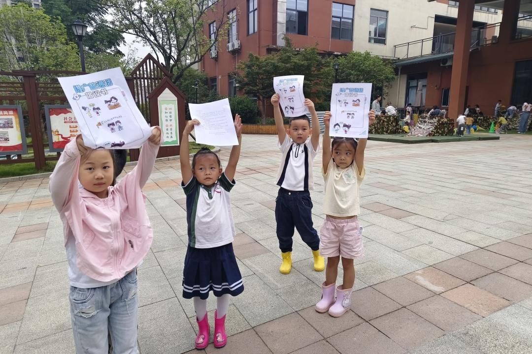 大班年级组的孩子们组成“推普小分队”,走进社区、街道,发放自制推普宣传单、邀请居民参与“普通话挑战小游戏”。