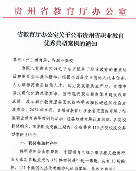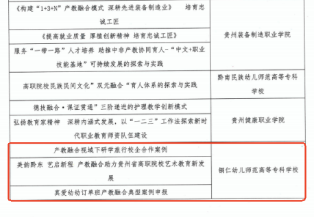 近日,贵州省教育厅办公室公布了2024年贵州省职业教育优秀典型案例评选结果,我校申报的《产教融合视域下研学旅行校企合作案例》《美韵黔东 艺启新程 ——产教融合助力贵州省高职院校艺术教育新发展》《真爱幼幼订单班产教融合典型案例》三个案例从全省370个参评案例中脱颖而出,成功入选“贵州省职业教育优秀典型案例”。