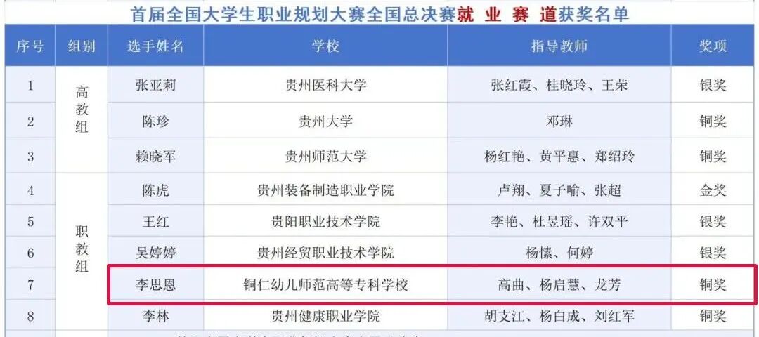 近日,在教育部印发的《关于公布首届全国大学生职业规划大赛全国总决赛获奖名单的通知》中,我校学前教育系李思恩同学获职教组就业赛道铜奖。
