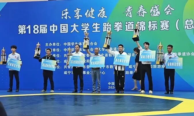 2024年7月22日至25日,第18届中国大学生跆拳道锦标赛(总决赛)在湖北咸宁举行,本次比赛有来自全国152所高校的915名运动员代表参加。作为全国大学生跆拳道最高水平的单项赛事,此次锦标赛备受社会各界关注。我校跆拳道代表队在比赛中斩获2金1银3铜的好成绩,获男子丙B组(体育专业组)团体总分第四,学校获“最佳组织奖”,张艺同学获“优秀运动员”称号。