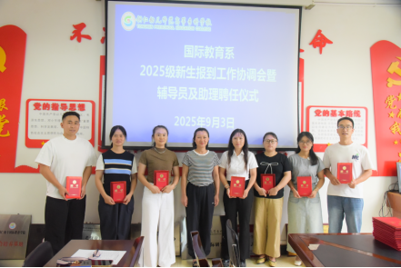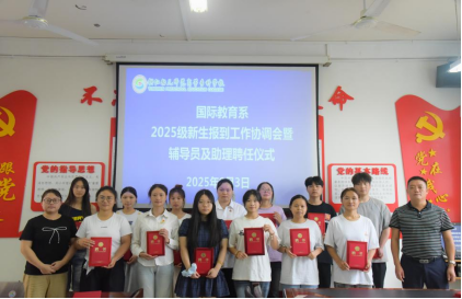 9月3日下午,国际教育系在系会议室召开2025级新生报到工作协调会暨辅导员及学生助理聘任仪式。系领导班子成员、各科室负责人、全体新生班辅导员和助理参加会议。