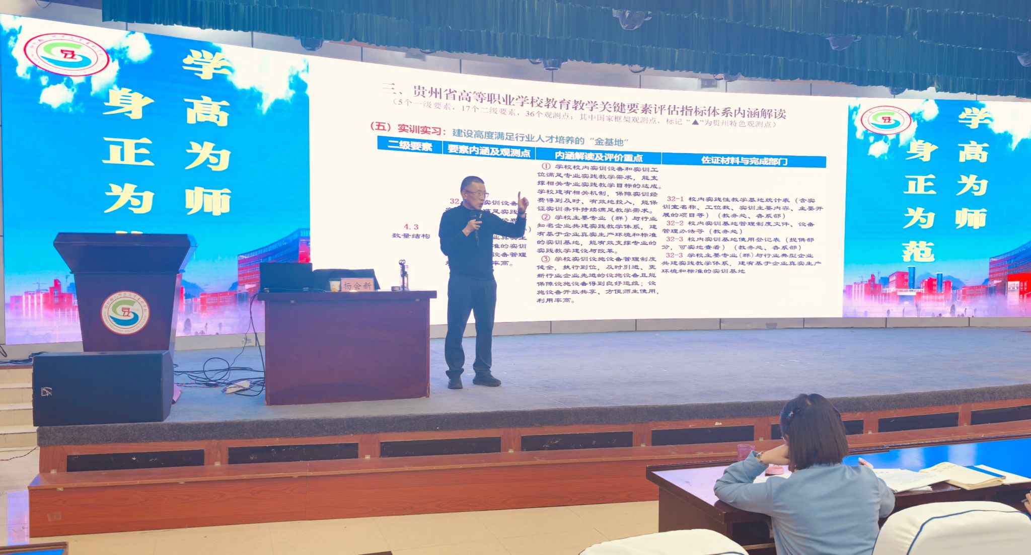 在专题培训环节,杨会新结合国家职业教育改革背景与政策导向,从评价总体要求、评估指标体系、评估工作实施及迎评策略四大维度出发,对贵州省高等职业学校教育教学关键要素评估指标体系作了深入剖析,并针对学校现状,在专业建设、课程教学改革、师资素养、学风教风等方面提出了针对性的指导意见。