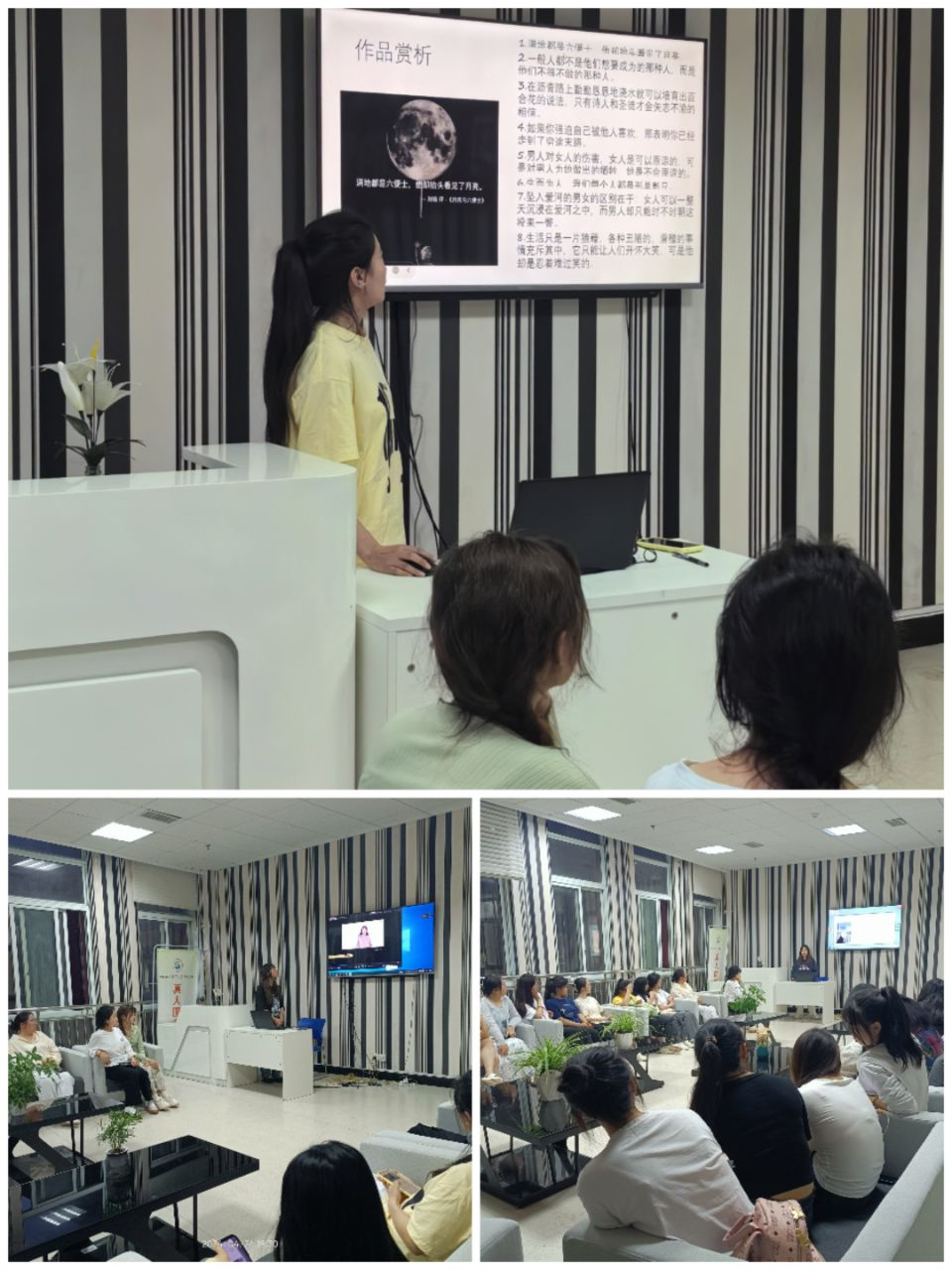 好书分享环节,“一岁一书”好书推荐活动获奖的三位同学以生动的语言和独特的视角,向在场的同学们分享了各自推荐书籍的魅力,引发了大家对阅读的思考和兴趣。语文A2302班的陈远桂为大家分享了《大雪将至》,她说:“这本书让我感受到了生命的坚韧与美好,让我更加珍惜每一个当下。”英语A2201班的廖铄莹同学分享了《人生忽如寄》,她表示:“这本书让我深刻认识到人生的无常,教会我要珍惜每一个瞬间,勇敢面对生活的挑战。”英语A2201班的钟娜同学则带来了《月亮与六便士》,她感慨道:“这本书让我明白了追求梦想的重要性,同时也让我认识到现实与理想之间的矛盾。”
