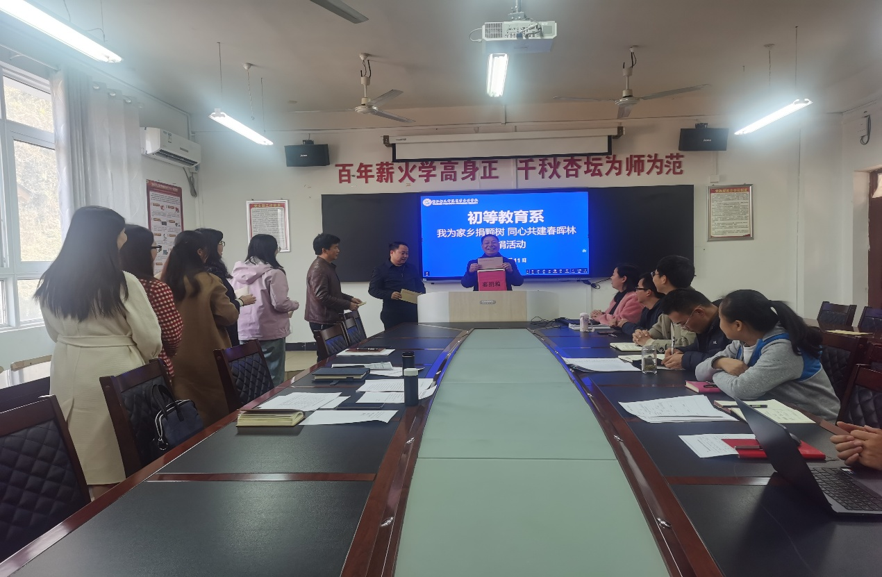 为深入落实习近平总书记关于绿水青山就是金山银山的重要指示精神,积极响应学校工会、团委倡议,以实际行动参与到生态文明引领铜仁现代化建设绿色发展,在黔东大地抓起绿色发展澎湃春潮,增强我系师生爱家乡责任感和使命感。3月11日上午,我系组织全体师生参加了“我为家乡捐棵树•同心共建春晖林”募捐活动,活动由初等教育系党总支书记卢道静主持。