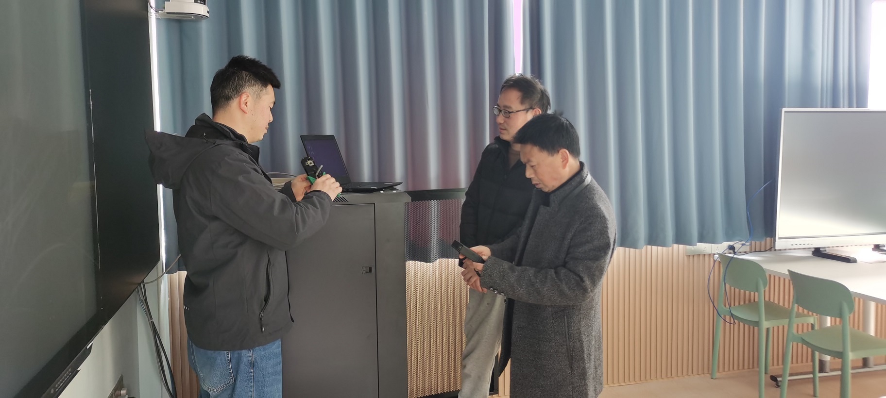 学校学术交流中心已建成并投入使用,各类功能教室、实训教室已经建设完成,相应的教学设备已经安装到位,为了更好地让实训教室发挥作用。3月11日,在信息中心副主任侯丰教授带领下,信息中心对学校学术交流中心网络接入到学校主干网络。