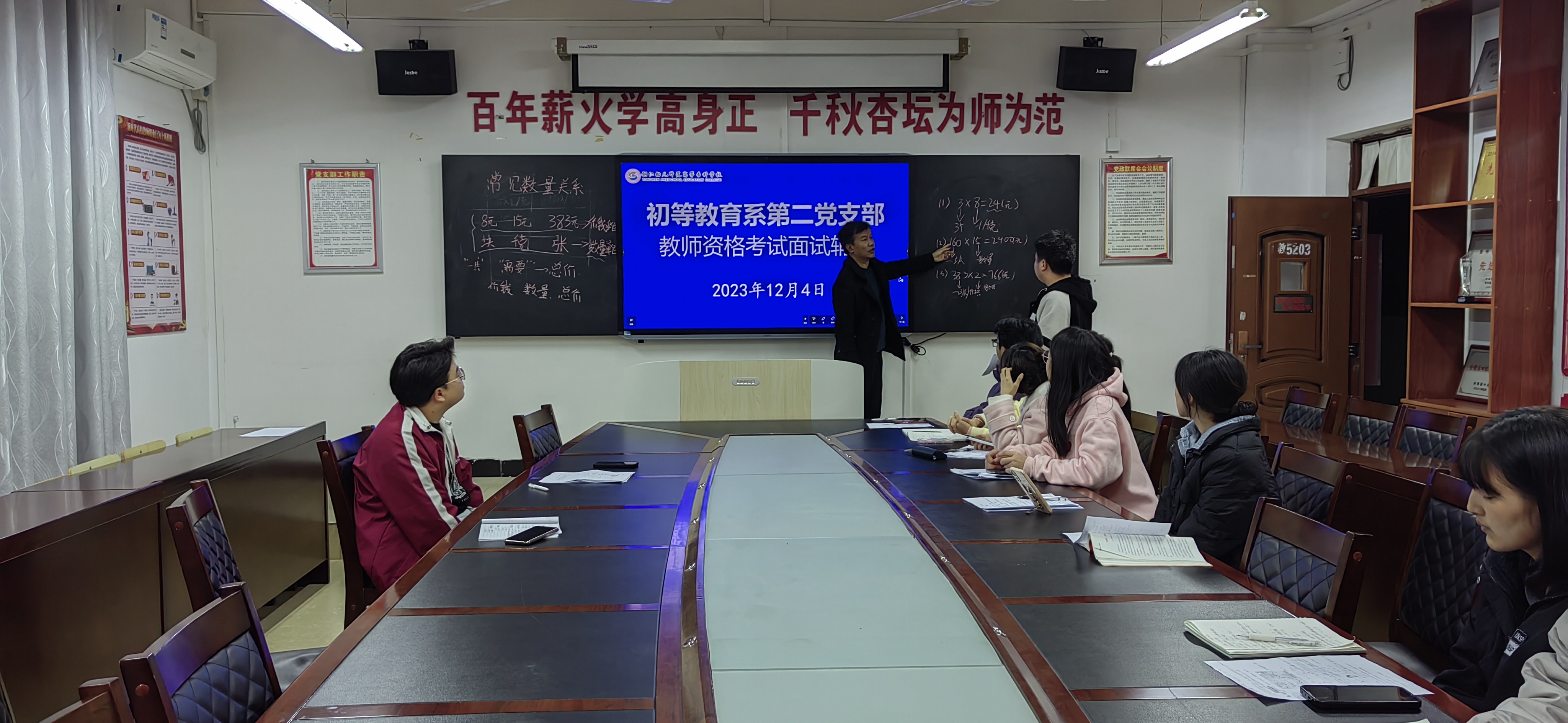 晚上,在系会议室对即将参加教师资格证面试考试的学生进行面试指导。向同学们介绍了教师资格证面试的基本流程,讲解面试误区及面试技巧,让同学们对教师资格证面试有了全面了解。党员老师分小组从备课、回答问题、试讲、问题答辩等方面进行了模拟。