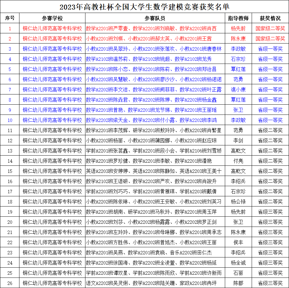 近日,2023高教社杯全国大学生数学建模竞赛成绩揭晓,我校共有26组参赛同学获奖,分别为国赛二等奖2组,省赛一等奖8组、二等奖8组、三等奖8组。我校在专科组获奖率位于贵州省前列。
