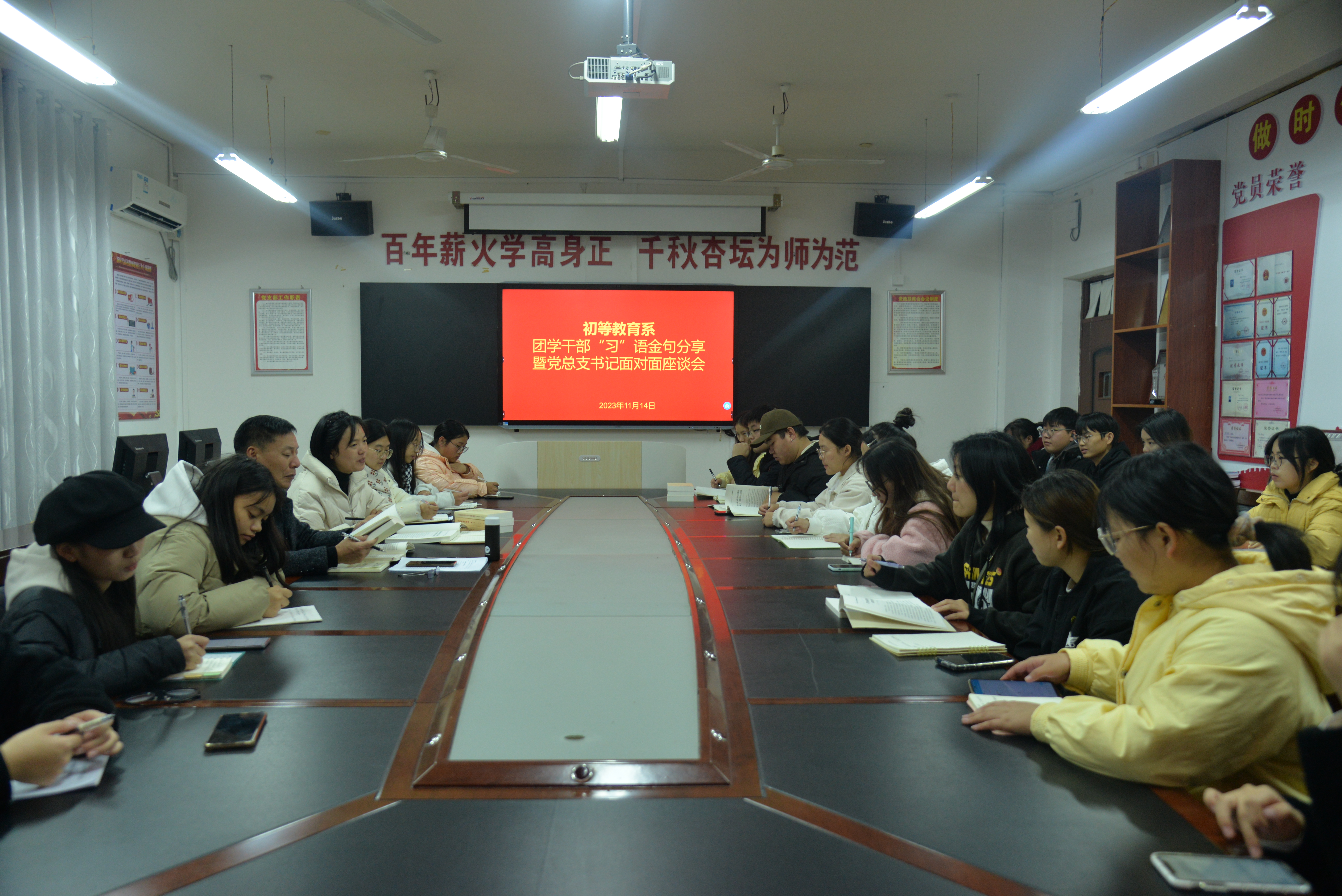 为推进学习贯彻习近平新时代中国特色社会主义思想主题教育走深走实,引领团员青年用党的创新理论武装头脑、指导实践、推动工作,初等教育系召开了团学干部读书分享暨党总支书记面对面座谈会,系党总支书记卢道静到会指导,系团总支指导教师周曾芹主持,全系16个团支部的团干部代表和新入团的10名团员参加。