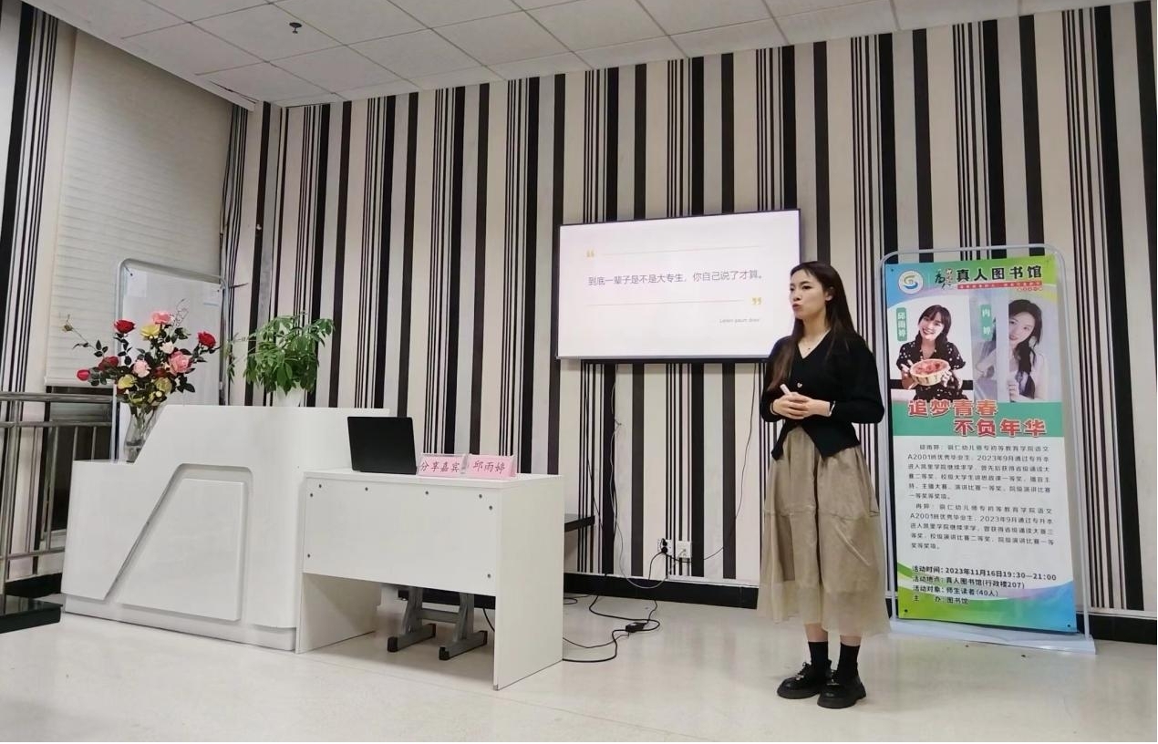读有故事的人,阅会行走的书。11月16日,在行政楼207活动室,本科教育学院汉语文学2301班冉婷与邱雨婷两位同学,以“追梦青春,不负年华”为主题分享了她们成功升本的经验,语文A2301班冉欣同学担任本期活动主持,全校40余名学生参加了本次活动。