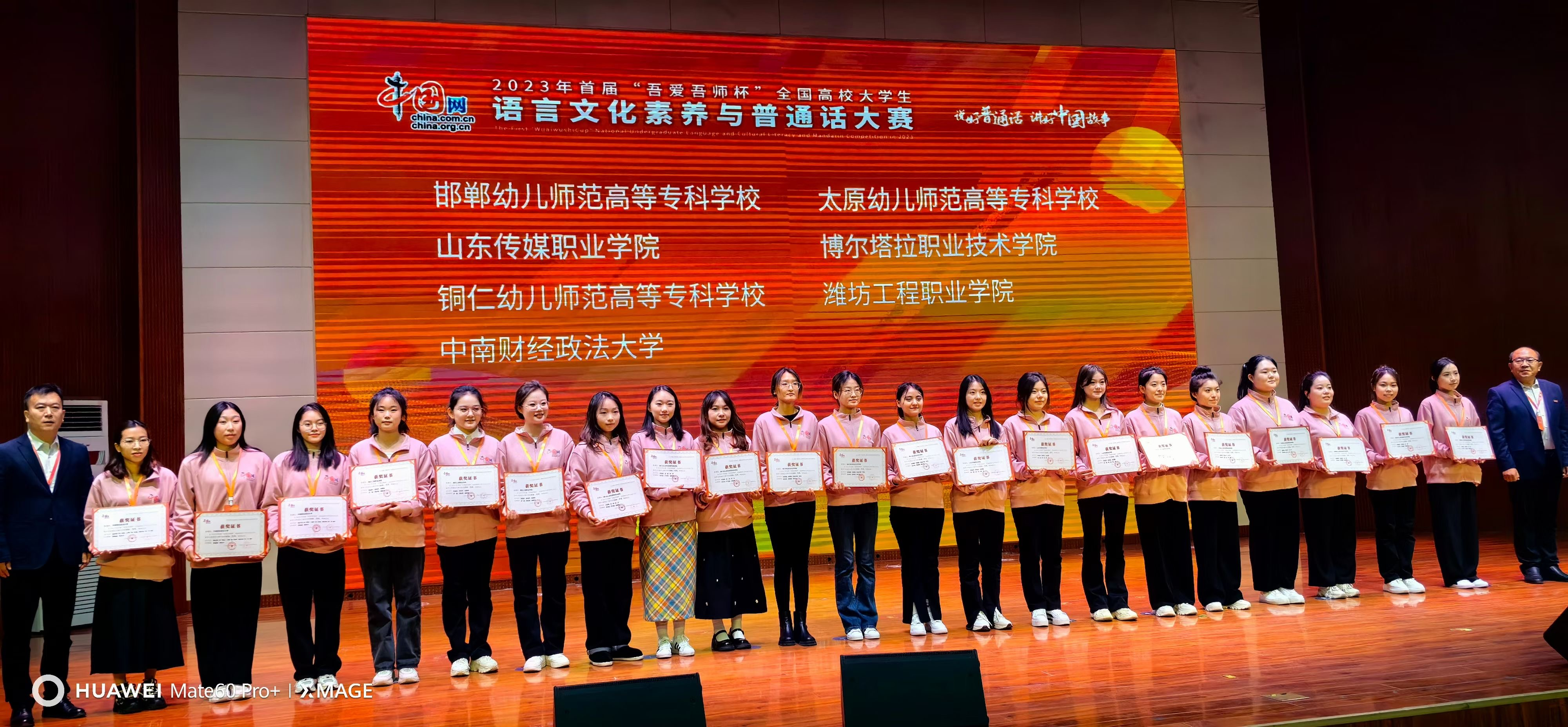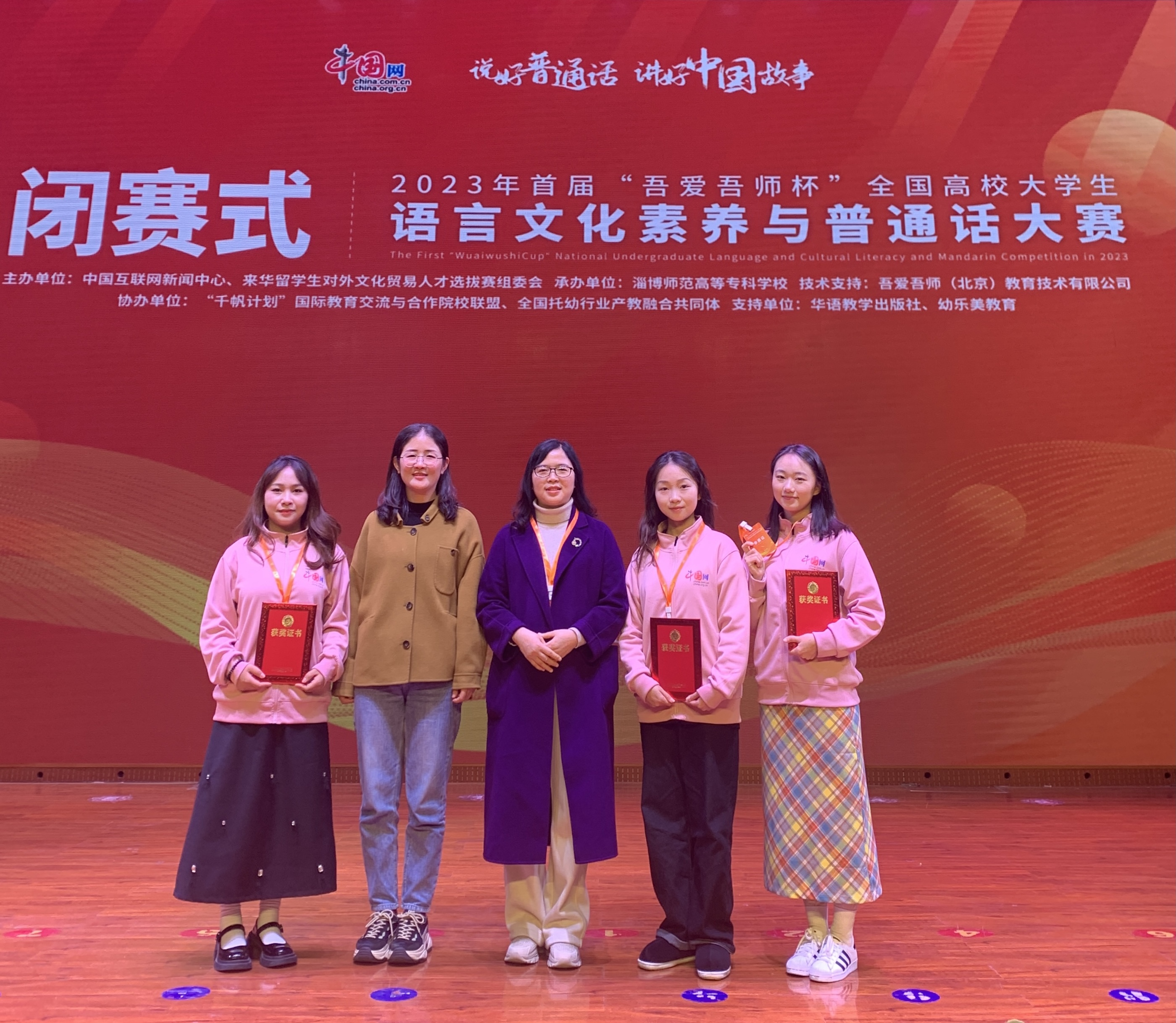 11月17日至19日,2023年首届“吾爱吾师杯”全国高校大学生语言文化素养与普通话大赛决赛在山东淄博师范高等专科学校举行。我校初教系教师旷光彩、国教系教师李书念和艺术系教师孟翠翠共同指导的学生张娇、刘亚楠、何月进入决赛,与本科、高职和中职院校的选手及留学生选手同台竞技,经过三个赛项激烈角逐,喜获团体二等奖。