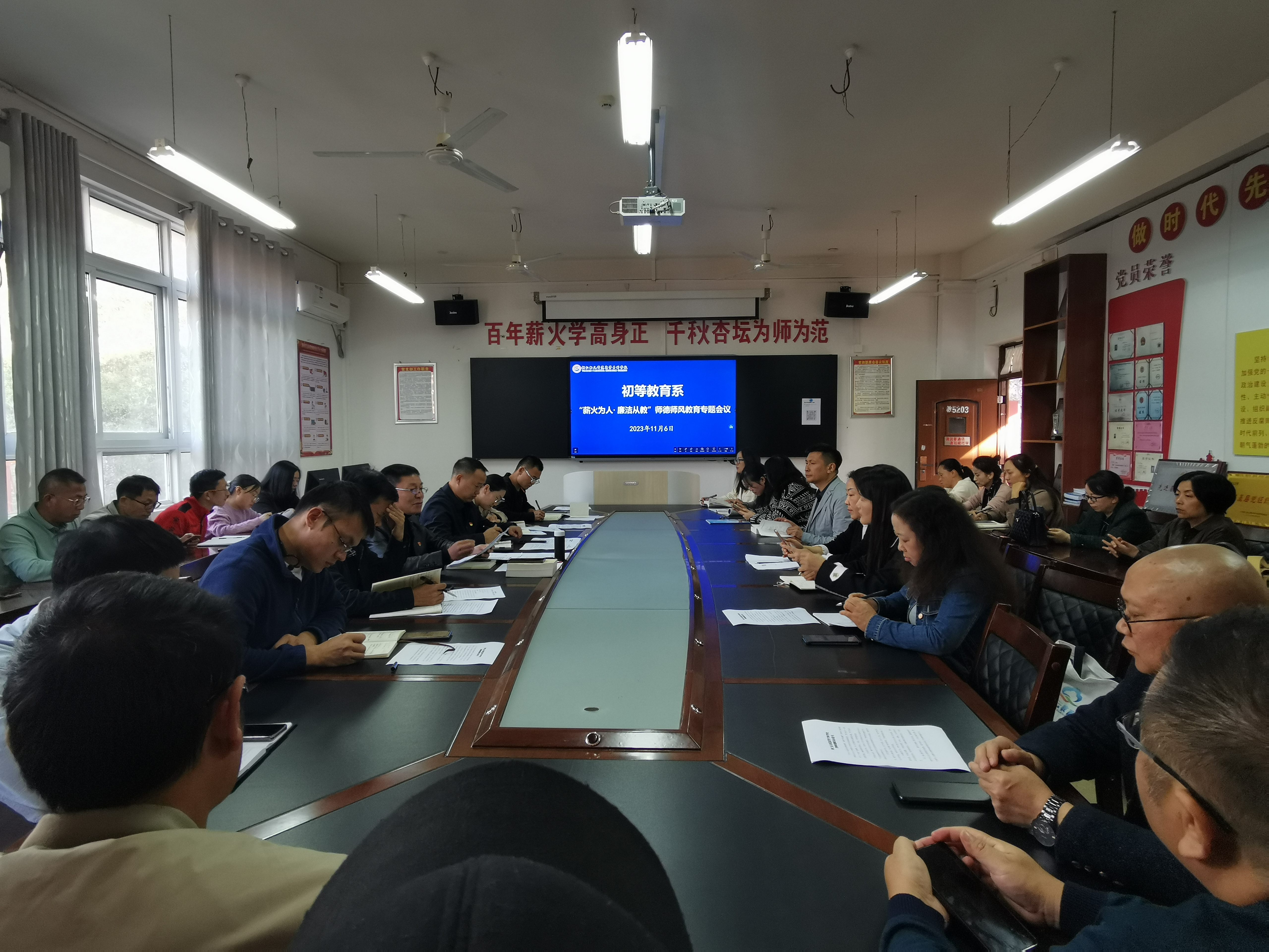 为全面深入开展学习贯彻习近平新时代中国特色社会主义思想主题教育,坚持立德树人根本任务,把师德作为评价教师的第一标准,提高教师思想政治素质和职业道德水平,突出师德养成,培育两代师表,推进师德师风建设制度化、规范化、常态化。近日,初等教育系开展“薪火为人·廉洁从教”师德师风建设专题教育,会议由系党总支书记卢道静主持,全系教师参加。