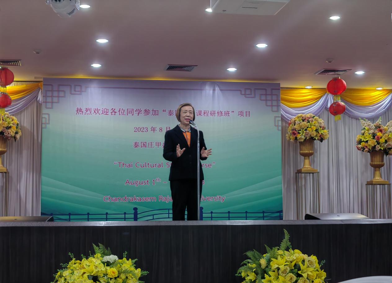 在开营仪式上,庄甲盛皇家大学国际事务处处长Asst.Prof.Dr.Tawat Khamthongthip介绍了学校的基本情况。校长Assoc.Prof.Dr.Sumalee Chaisuparakul致开幕词,她表示,欢迎中国贵州高校的师生们来到泰国交流学习,感受泰国传统文化,希望每一位同学都能有所收获,成为推动中泰文化交流的使者。