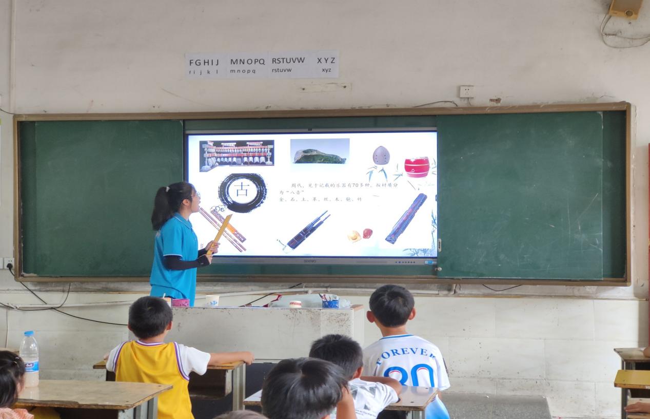 课堂上,志愿者刘飞向小朋友做玉屏箫笛相关知识的普及,讲述了有关箫笛的历史故事 《萧史弄玉》,教授他们演奏时的正确姿势和基础知识,加深他们对中国传统乐器的印象。刘飞从河南舞阳贾湖骨笛讲起,介绍了中国古代的乐器知识,包括周代的“八音”分类法,使儿童了解了中国丰富的乐器历史文化。志愿者们还讲解了玉屏箫笛制作技艺相关的历史传说,边讲边示范演奏手上的箫笛,课程内容丰富多彩,教室里时时响起儿童们的阵阵掌声。