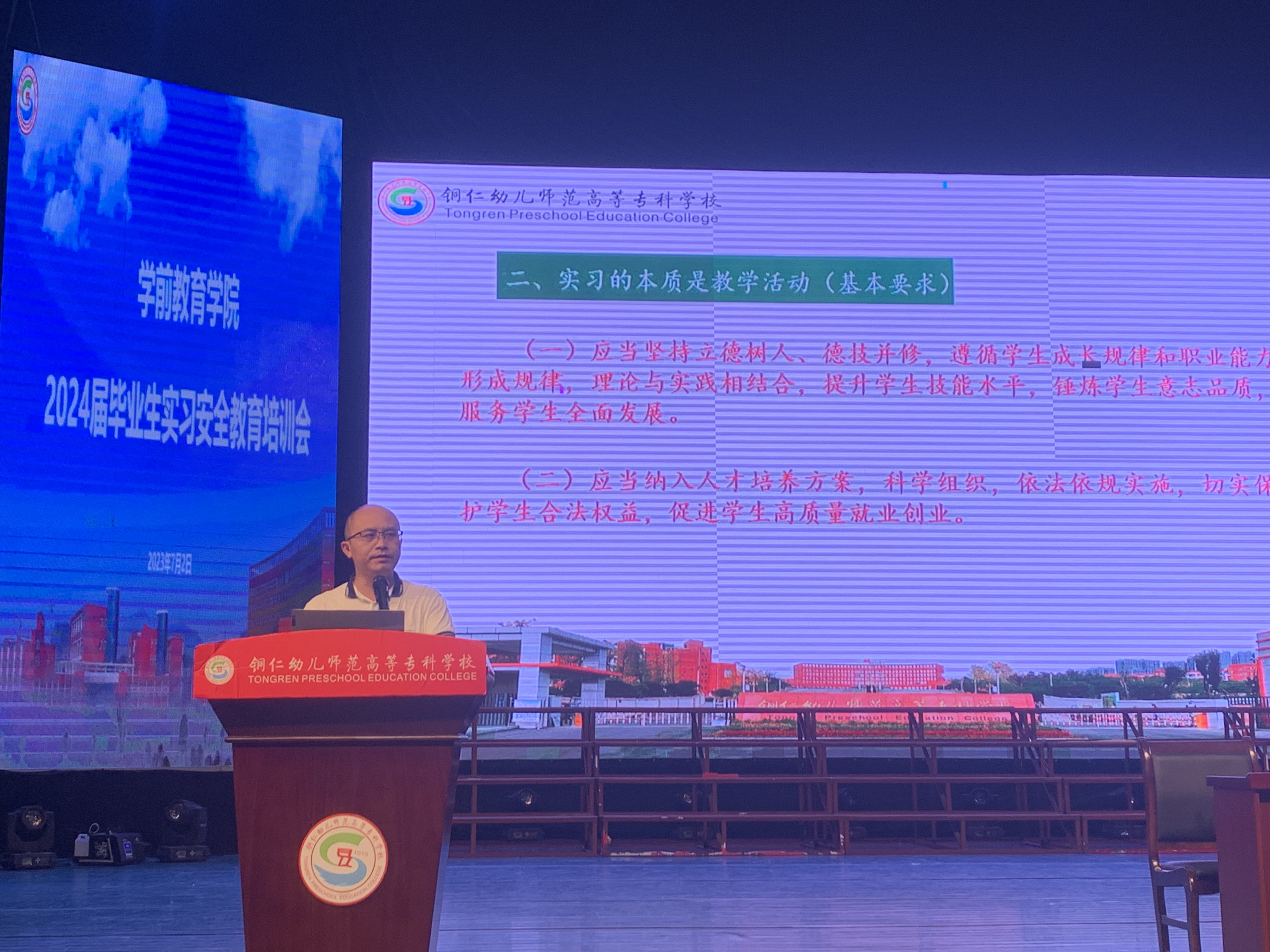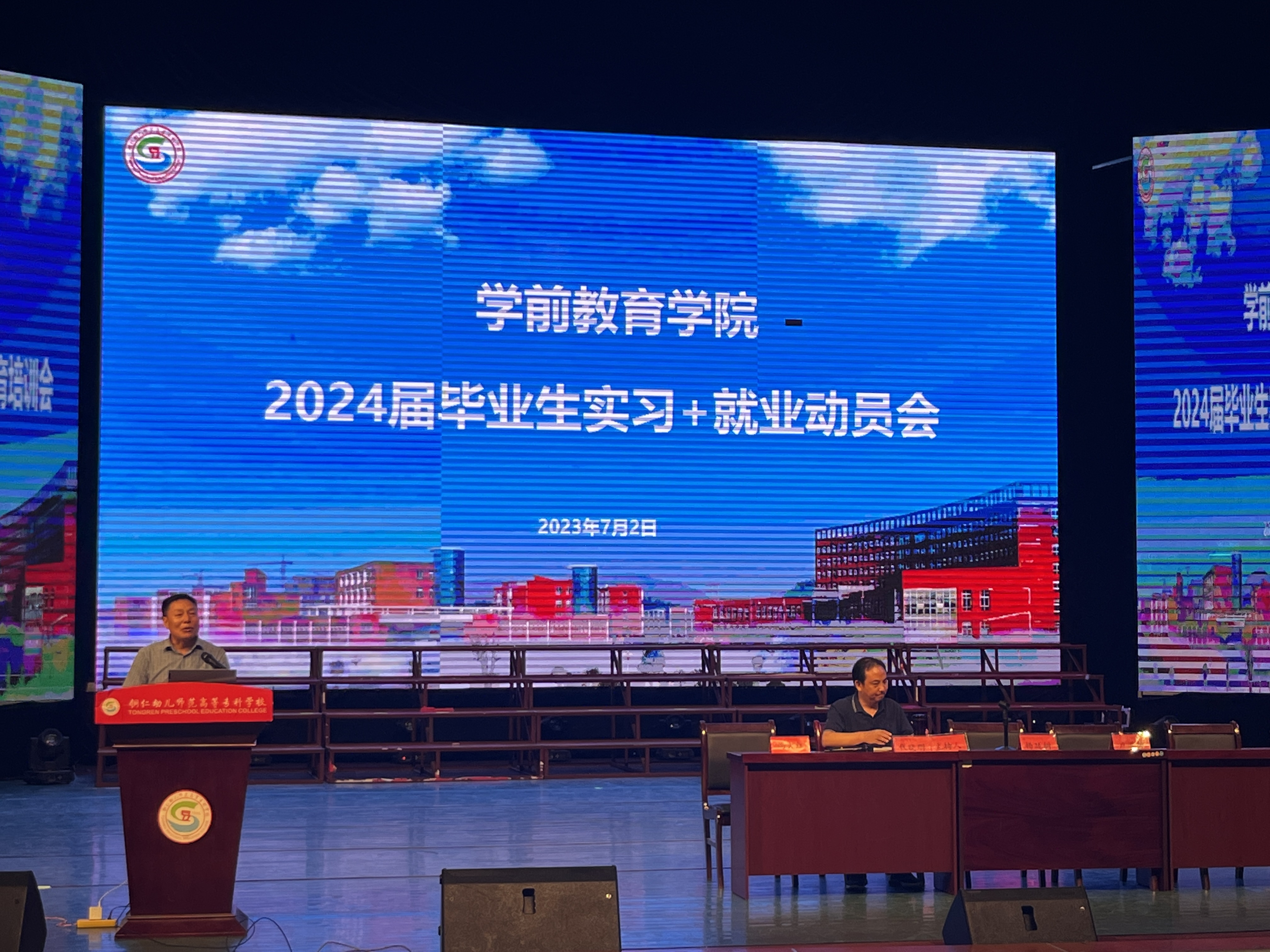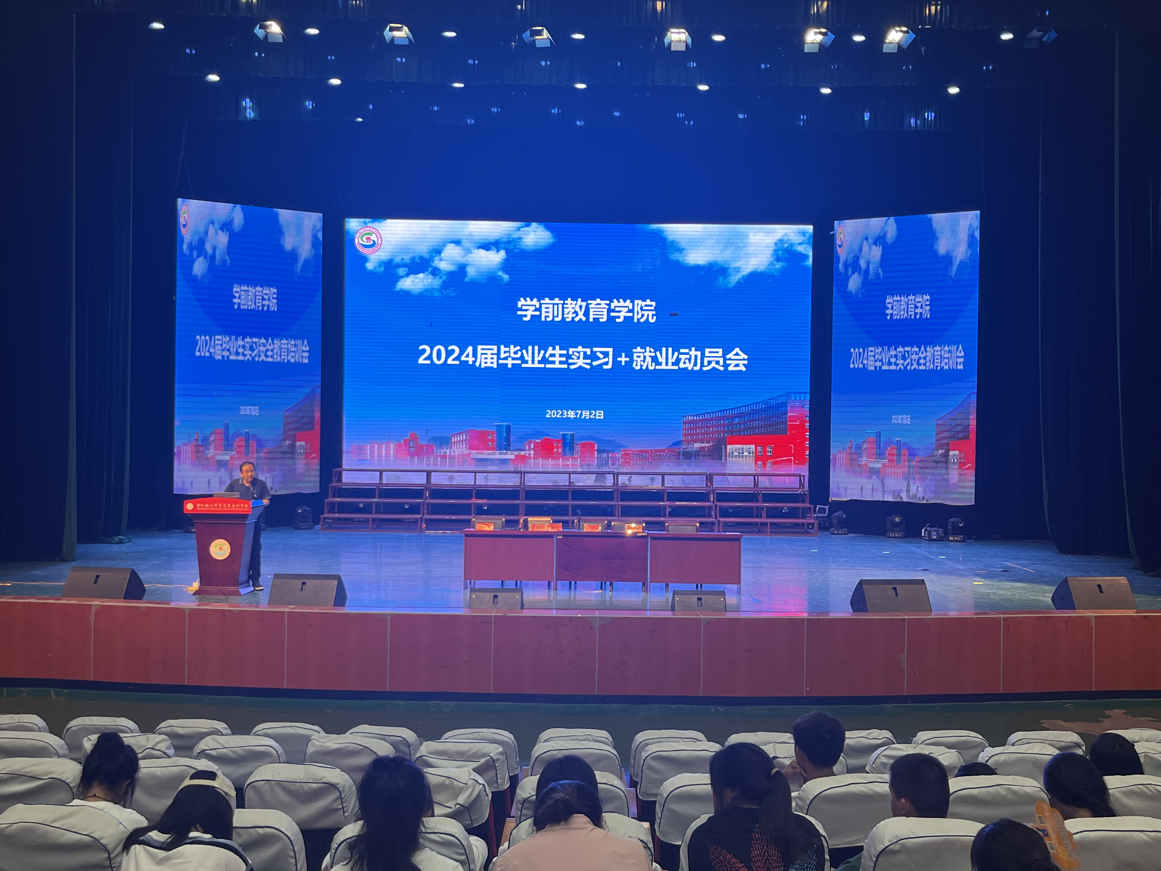 为动员教育学前教育学院全体学生统一思想,提高认识,明确实习任务,深入扎实开展毕业实习。近日,学前教育学院2024届毕业生实习暨就业工作动员会在大学生活动中心举行。学前教育学院卢道静书记、院长代晓明,教务处长杨廷树,学前教育专业秘书冯大红老师,招就处杨通路老师,学院各科室负责人,2021级各班辅导员、实习指导教师及2021级全体学生参加此次动员大会。