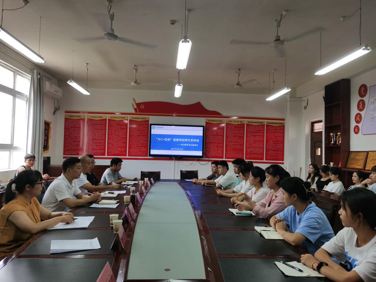 为了认真做好2023届毕业生教育工作,着力构建“为仁印记”思政工作体系,进一步引导青年学生成为有理想,有担当,能吃苦、肯奋斗的“六有阳光青年”,促进毕业生以良好精神风貌和饱满工作热情走出校园、融入社会。6月18日中午,艺术与体育教育学院在八栋二楼会议室召开2023届毕业生代表座谈会。艺体学院党总支书记万昊、副院长谢国、全院副科级以上干部、毕业班全体班主任及毕业班优秀学生代表参加会议。座谈会由院党总支副书记杨显英主持。