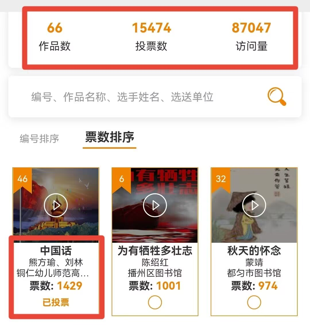 在网络投票阶段,教师作品《中国话》以1429票位居其他组榜首,学生作品《红铁》《我们的青春》分别以1504、1314票位居大学生组前二名。