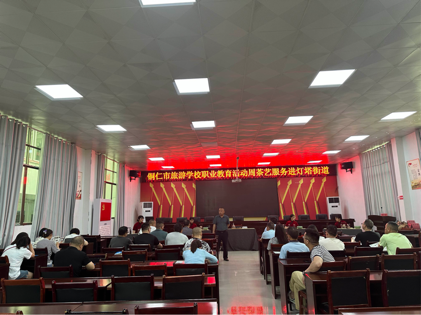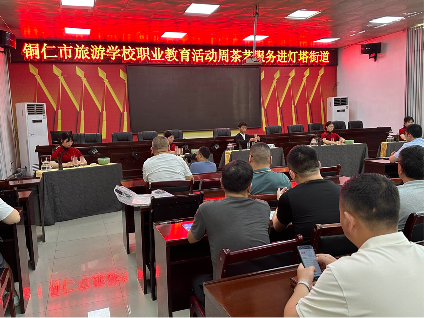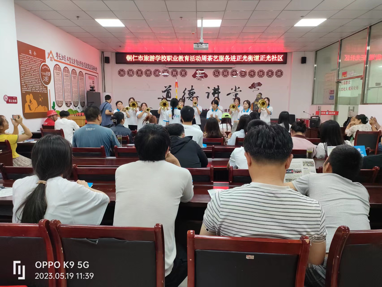 职业教育宣传进社区。5月19日,铜仁市旅游学校充分发挥专业技能优势,走进铜仁市碧江区正光办事处、灯塔办事处及所辖安置区,开展“茶艺展示进社区”、“茶文化讲解进社区”和“管乐演奏队进社区”等活动,同时做好旅游学校的职业教育宣传,增强服务社会、服务群众意识,以实际行动弘扬和传递社会正能量。