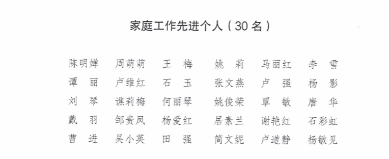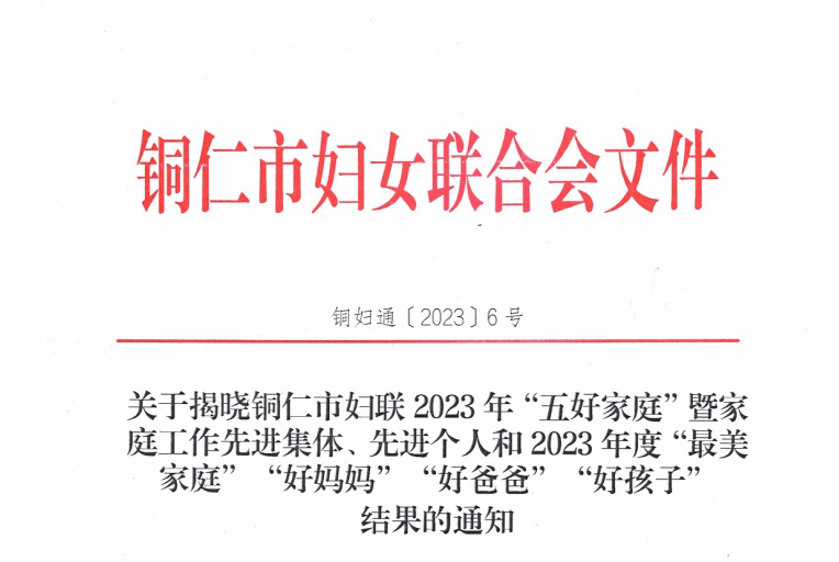 近日,经铜仁市妇女联合会评选,我校学前教育学院党总支卢道静同志获2023年铜仁市“家庭工作先进个人”称号;艺术与体育教育学院李宗奎同志家庭获2023年铜仁市“五好家庭”称号、其爱人颜玉玲同志获“好妈妈”称号。