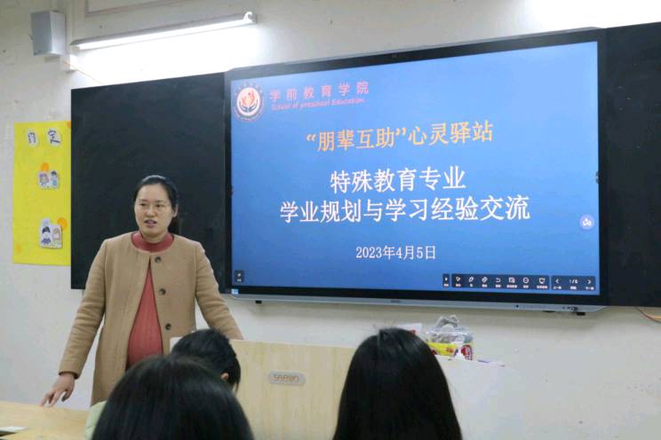 为充分发挥朋辈优秀学生在思想引领、学业实践等方面的榜样示范作用,帮助特殊教育专业低年级学生做好学业规划,摆脱迷茫心态,找到努力方向,掌握学习方法,4月5日,学前教育学院在3201教室开展第二期“朋辈互助”心灵驿站经验交流分享会活动,主题为“特殊教育专业学业规划与学习经验交流”,此次交流会邀请了特殊教育专业A20级的龙缘、李欢两位成绩优异、表现突出的同学作为分享嘉宾,活动由学院学生科王敏老师主持,特殊教育专业A21级和A22级学生参加。