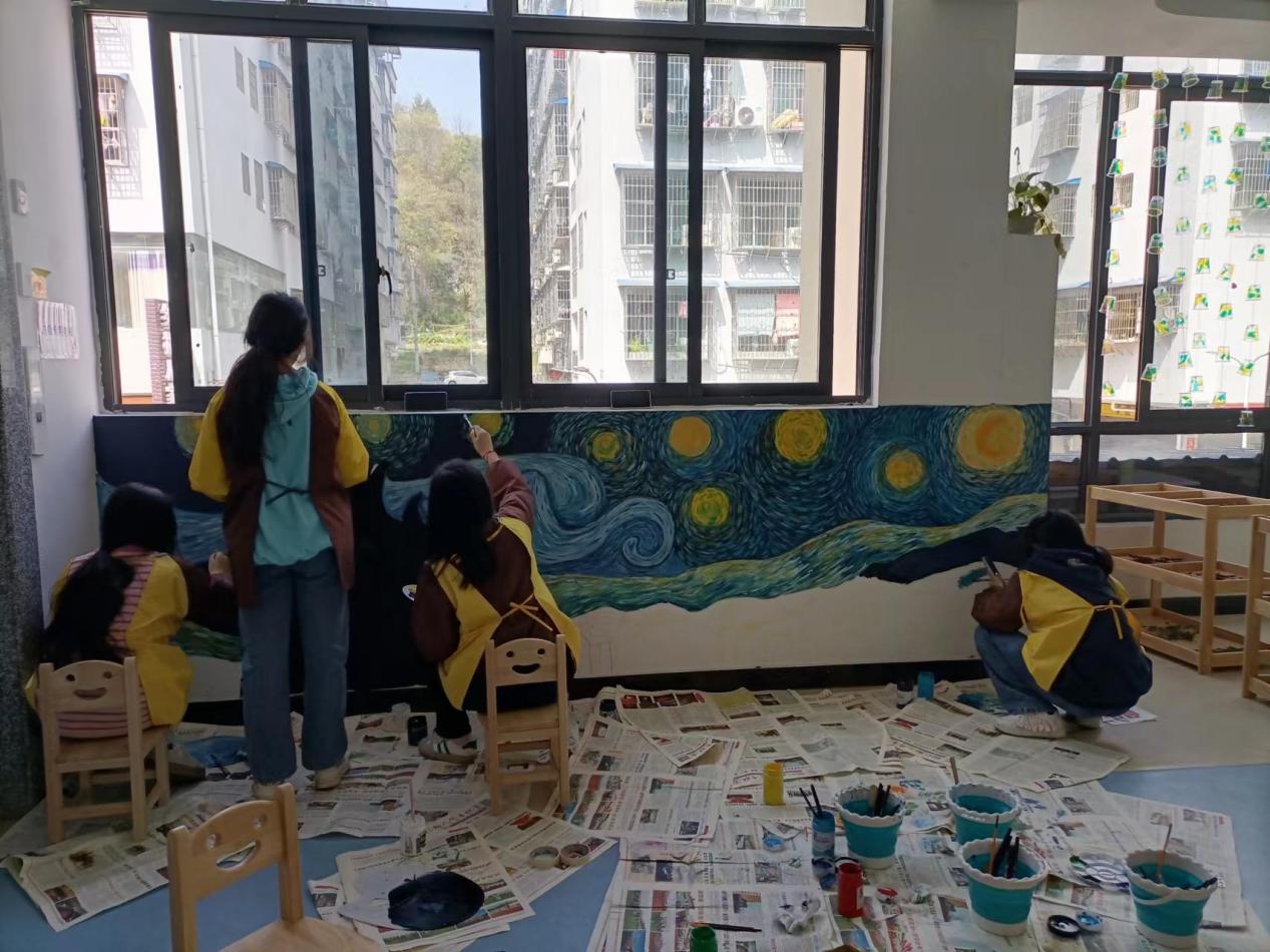在铜仁幼专附属幼儿园,经过创作团队三天的努力,一幅幅精美的绘画作品呈现在人们面前。看到这些精彩的作品,幼儿园的孩子们激动地说:“我太喜欢这些画了,真漂亮!”墙绘作品丰富多样,既有梵高那充满激情的后印象派名作“星空”,也有蒙德里安般如美妙乐曲一般的抽象画,还包括富有地方特色的苗绣、蜡染等民间艺术作品。彩绘活动圆满结束后,受到了幼儿园领导、教师以及孩子们的高度赞誉和一致好评。(图文/申肖飞)