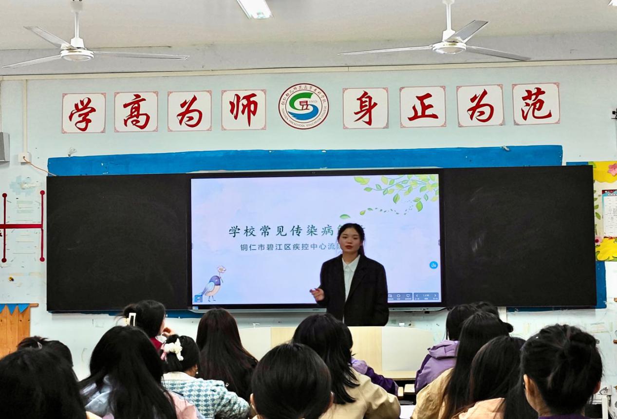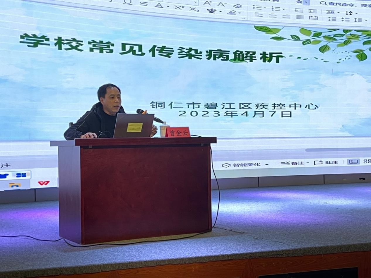 活动期间,我校邀请铜仁市碧江区疾控中心副主任杨光荣等一行5人到校进行了专业指导与培训。4月7日晚,在行政楼学术报告厅开展了春夏季健康教育培训,来自各班级的200余名学生代表参加,现场座无虚席。