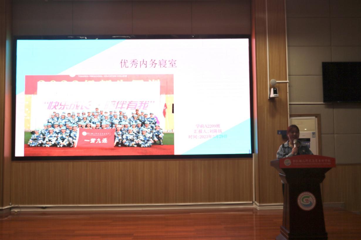 本次活动分为两个部分。首先由刘陈钱同学和滕春芳同学与同学们做交流分享,她们所在的寝室在今年的军训内务评比中均获得了优秀的成绩。刘陈钱分享了她们在争创优秀寝室的一些心得体会,倡议同学们要团结一致、互帮互助,共同打造干净整洁和谐的宿舍环境。同时强调良好宿舍环境的重要性,呼吁同学们重视宿舍文化建设,为美好的大学生活奠定良好基础。滕春芳同学则为同学们展示了她们宿舍的小成员、小制度、小公寓、小美好以及小目标,体现了宿舍成员之间关系和谐,氛围融洽。