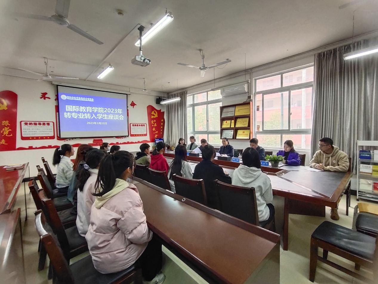 为了更好地促进转专业学生适应新环境,加深同学们专业认同感,帮助转专业的同学调整心态,2023年3月31日,国际教育学院于院会议室召开转专业学生座谈会。本次座谈会由学生科科长姚治松主持,院长张丽妮、副书记陈驷、各科室负责人、2022级小教英语全体辅导员以及新转入学生参加会议。