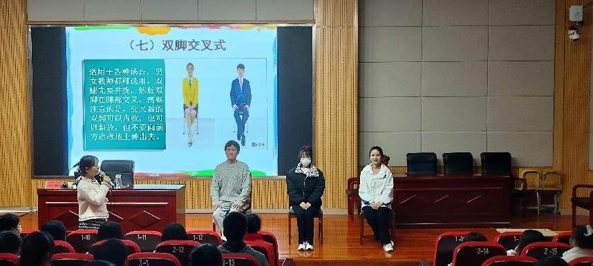 杨帆分别从站姿、坐姿、蹲姿、走姿四方面,讲解作为一名优秀幼儿园教师应该具备的基本礼仪知识。除老师现场示范,还邀请了部分同学上台演示。杨老师用轻松幽默的语言与观众互动,对上台同学的坐姿进行现场指导,纠正其不规范之处,倡导同学们在学习、工作和生活中要塑造良好的自我形象,规范自身礼仪动作,在举手投足间展现自身魅力。