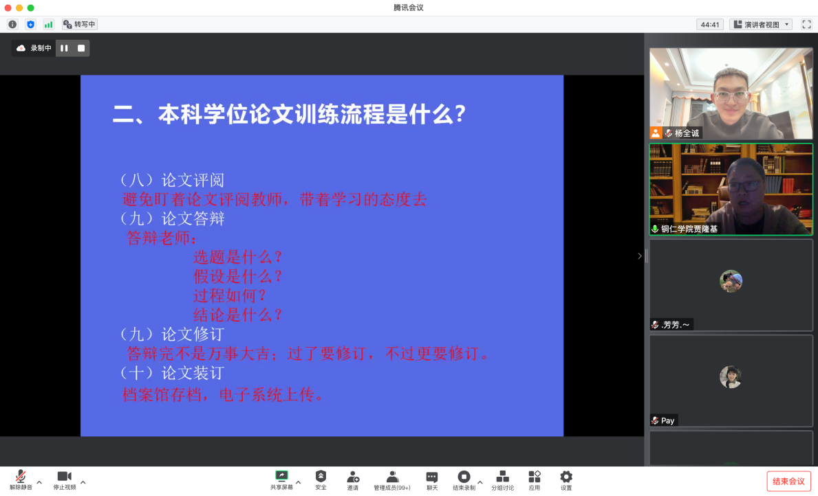 11月8日晚,铜仁学院大健康学院党政办副主任贾隆基在腾讯会议上开展《如何撰写毕业论文》专题讲座。讲座中从撰写学位论文的缘由、学位论文训练的流程与工具、学位论文的框架结构以及如何写好学位论文等五个角度来分享了寻找课题的经验、撰写论文的思绪以及写好论文的步骤。针对学生关于撰写论文提出的“论文有些理论需要数据支撑,什么样的数据才具有参考性?这样的数据去哪些地方会比较有权威性呢?”“对于教育类的论文,是否需要自己去研究,如若数据研究不够多,那论文是否就不具有代表性?”等问题,贾老师在互动答疑环节逐一进行了解答,贾老师精彩的分享与耐心地解答让学生对毕业论文豁然开朗,对毕业论文的写作有初步的了解。