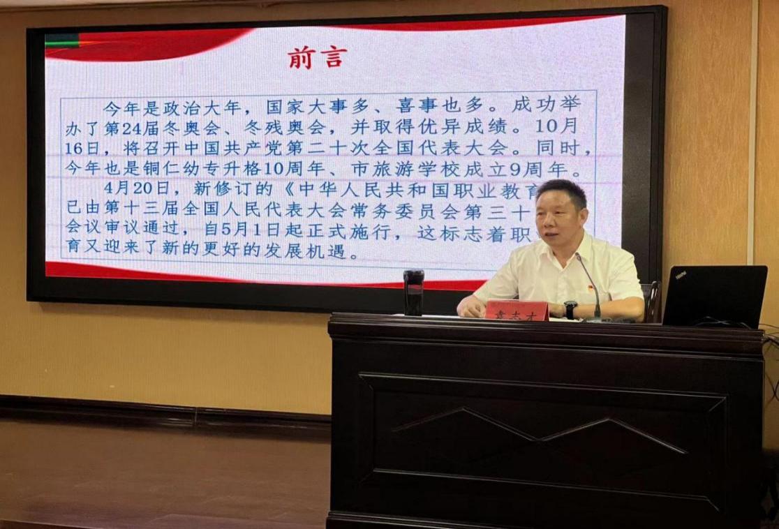 新生入学教育是入校后的重要一课,是职业教育的开端和基础。旅游学校把新生入学教育作为加强和改进学生思想政治教育的重要内容及推动人才培养的有效途径,采用“党建+引领成长”的方式,九月党员活动日,市旅游学校党总支书记袁志才以“喜迎二十大 奋进新征程”为主题,给全体师生上开学第一课。课堂中,袁志才以通俗易懂的语言、深入浅出的理论,讲述了政治教育的重要内容及推动人才培养的有效途径,引领新生成长。