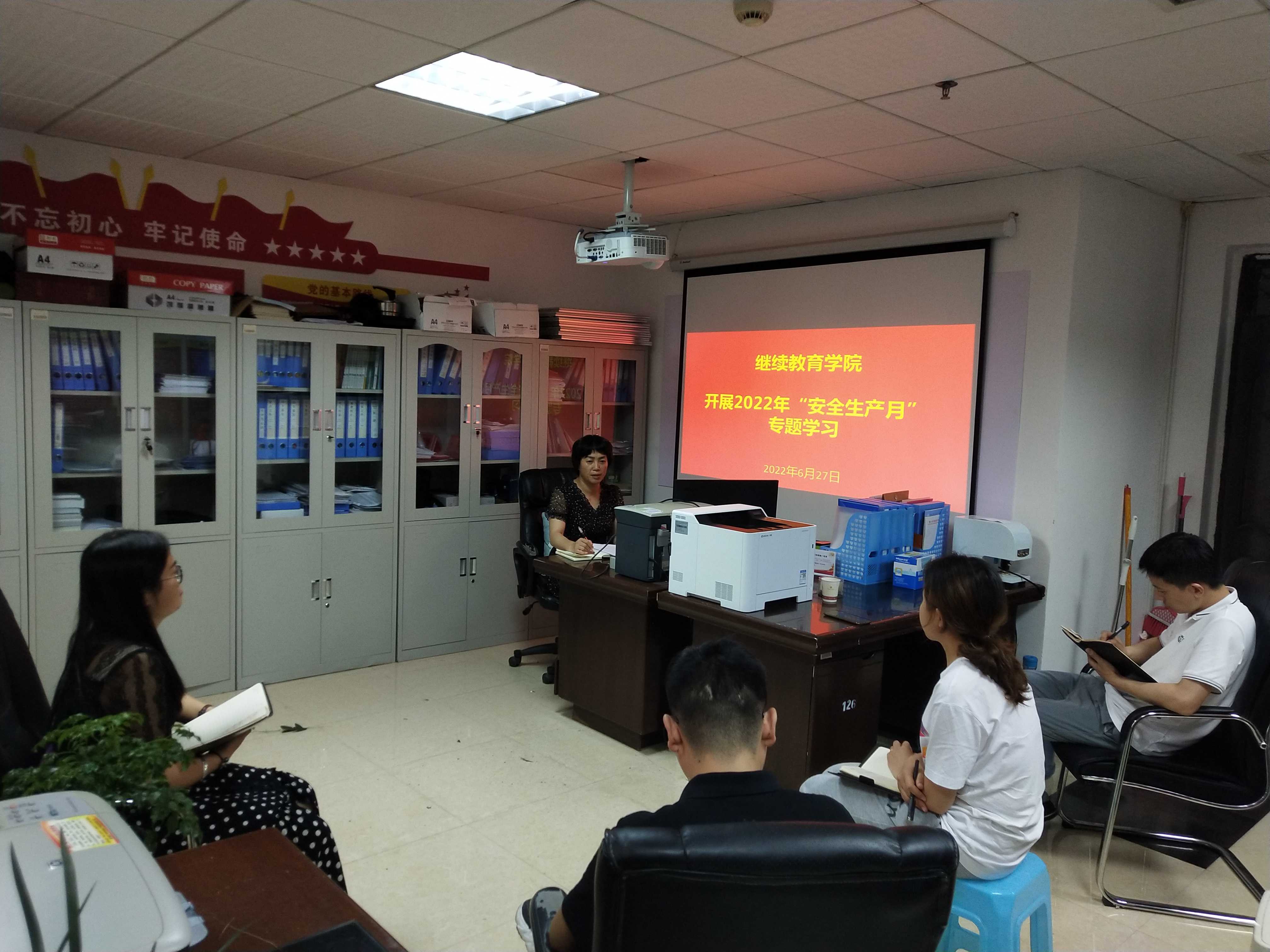 为深入宣传学习贯彻落实习近平总书记关于安全生产重要论述,坚持人民至上、生命至上,推动树牢安全发展理念,6月27日,继续教育学院根据《铜仁幼儿师范高等专科学校< 关于开展2022年“安全生产月”活动通知>》文件精神,在行政楼五楼会议室组织全体教职工开展安全生产专题学习会,会议由继续教育学院副院长王珺主持,学院全体教职工参加。