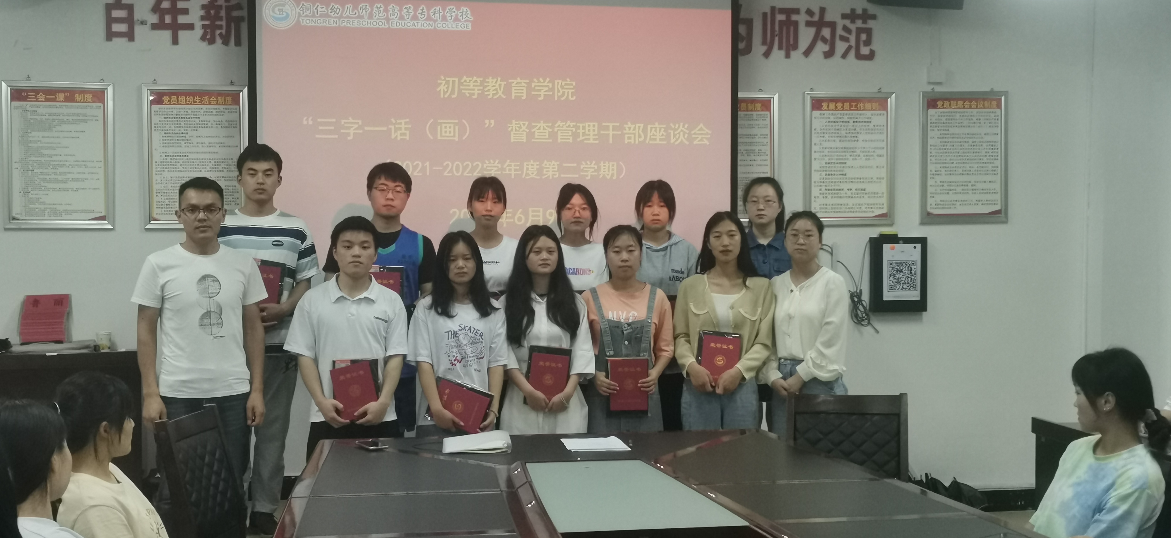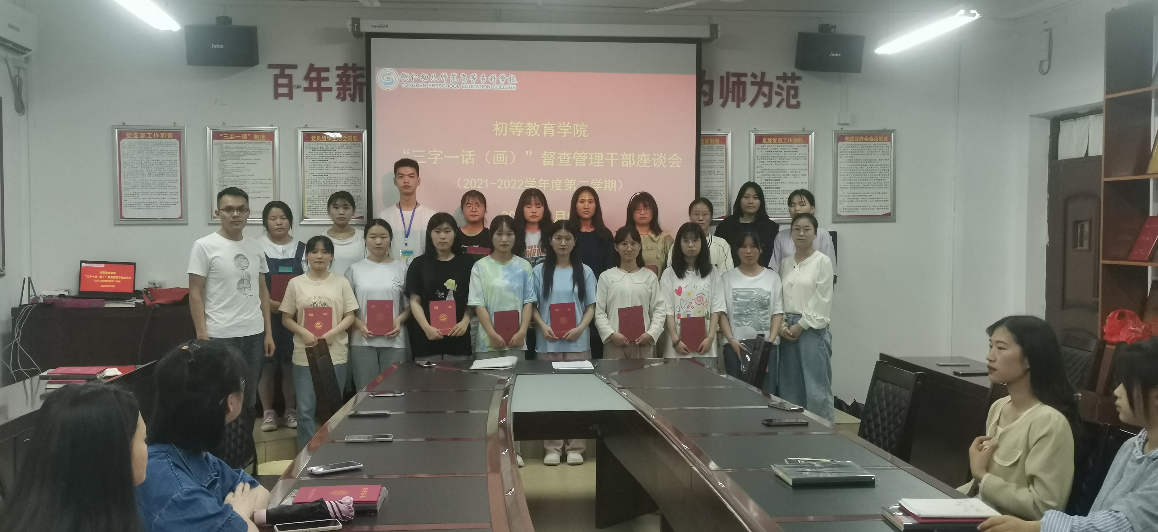 6月9日晚,初等教育学院在院会议室召开“三字一话”督查管理干部座谈会。会议由教务科黄丽娟老师主持,教务科副科长杨公禄、大一和大二督查干部共31人参加了会议。