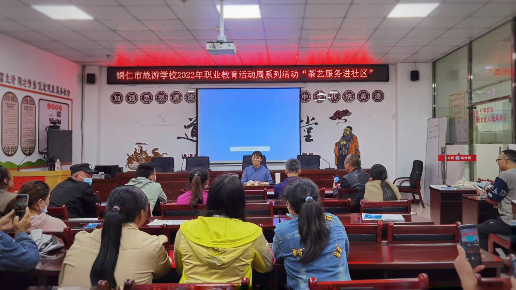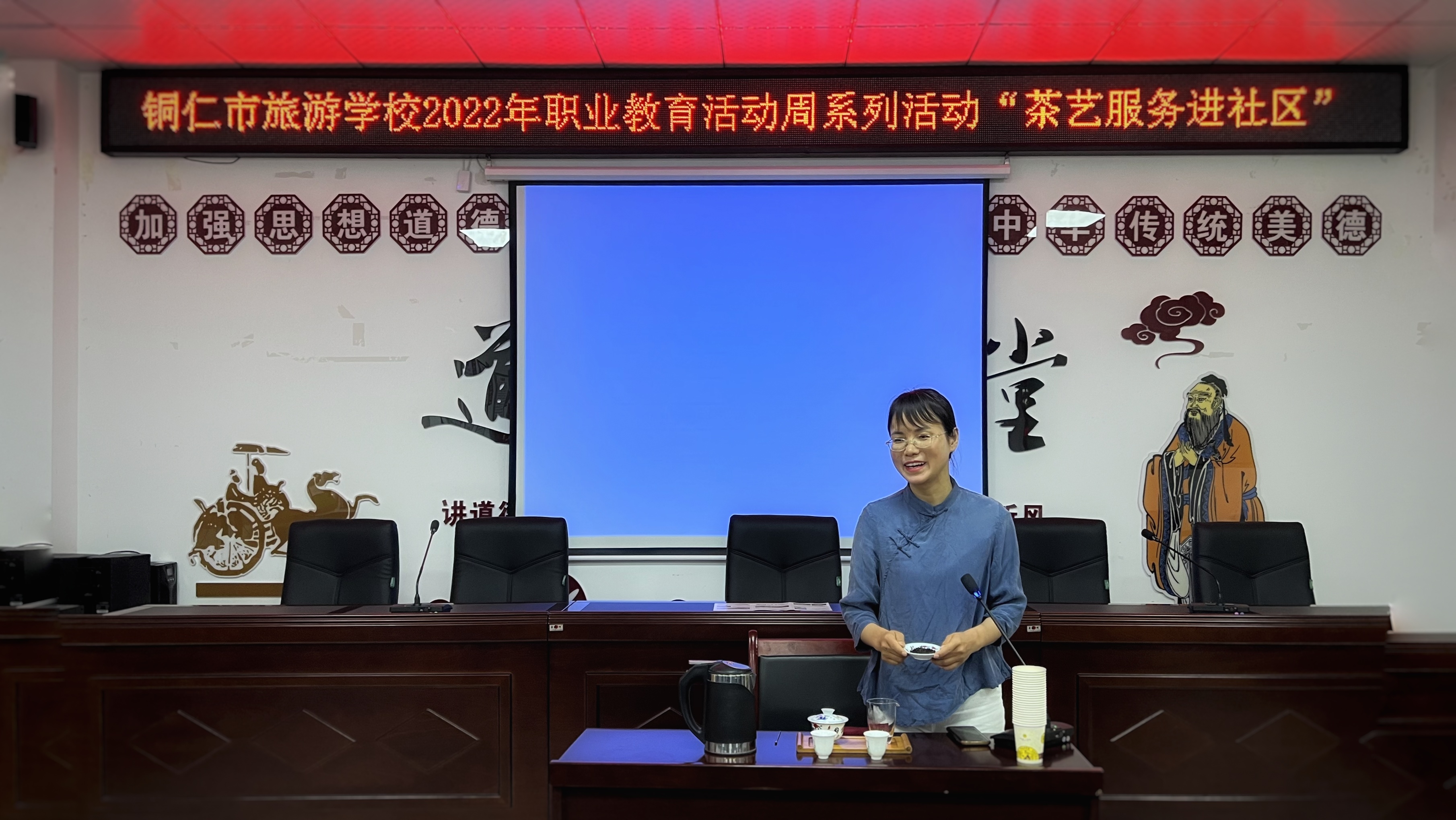 活动中,谢毅介绍了学校的办学情况、专业特色及2022年专业招生计划,并对新《职业教育法》进行了解读,引导社区居民正确认识当前职业教育最新政策和发展前景,了解本地旅游产业化发展趋势和旅游专业的就业前景。专业教师龙颖现场展示了茶艺表演并讲解茶知识。