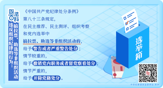 2021年1月,中共中央纪委机关、中共中央组织部、国家监察委员会联合印发的《关于严肃换届纪律加强换届风气监督的通知》明确规定:“在民主推荐和选举中搞拉票、串联、助选等非组织活动的,一律排除出人选名单或者取消候选人资格,并视情节轻重给予党纪政务处分,贿选的依法处理”。