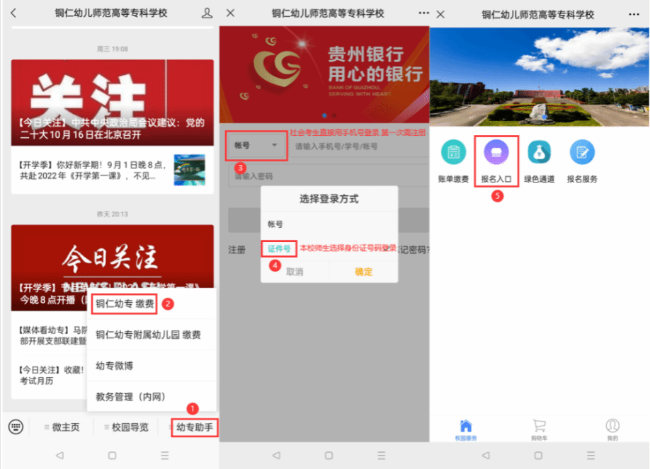2.点击“幼专助手”——“铜仁幼专缴费”——登录进入后,选择“报名入口”。若忘记密码,可修改。