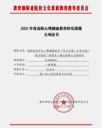 近日,教育部职业院校文化素质教育指导委员会正式公布2025年度高职心理健康教育研究课题立项通知。我校新获批2项教育部职业院校教指委2025年度高职心理健康教育研究课题。