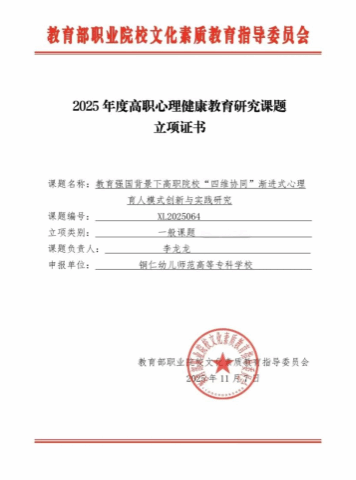 我校学前教育课程研究中心主任、北京师范大学教育学部在读博士研究生包兵兵教授主持的《高职院校心理健康素养“双元共建·任务引领·数字赋能”课程育人模式构建与实践研究》,学前教育系学生科副科长、心理学专业教师李龙龙副教授主持的《教育强国背景下高职院校“四维协同”渐进式心理育人模式创新与实践研究》获批一般课题立项。