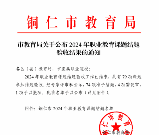 近日,铜仁市教育局发布2025年全市职业教育科研项目结题评审结果的通报。我校承担的铜仁市职教重大课题等8项市级项目顺利结题,创历史新高。