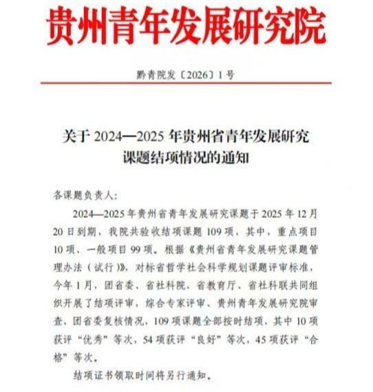 近日,贵州青年发展研究院发布《关于2024—2025年贵州省青年发展研究课题结项情况的通知》,团省委、省社科院、省教育厅、省社科联共同组织开展了2024—2025年贵州省青年发展研究课题结项评审。我校学前教育课程研究中心包兵兵教授主持的一般项目《“在地国际化”办学赋能高校青年大学生对外传播新格局构建的贵州实践研究》获得结项“良好”等次,马克思主义教学部余菲教授主持的一般项目《社交媒体背景下贵州大学生择业就业观研究》获得结项“合格”等次。