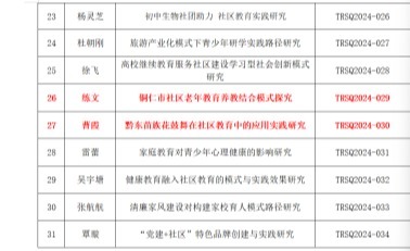 刘正艳老师主持的《数字化赋能铜仁社区教育促进居民终身学习模式构建研究》,聚焦数字化时代背景,探索如何借助信息技术为社区教育注入新活力,构建促进居民终身学习的有效模式。李璇老师以碧江区河滨公园金钱杆表演为例,开展《基于地方非遗传承的社区教育课程开发研究——以碧江区河滨公园金钱杆表演为例》,旨在通过开发地方非遗课程,传承优秀传统文化,丰富社区教育内容。王莹老师的《学习型社会视域下铜仁市老年教育资源“反哺”社区教育的模式与机制研究》,则从学习型社会建设角度出发,挖掘老年教育资源潜力,推动其反哺社区教育。成黎花老师的《基于铜仁民族音乐资源的社区终身学习课程开发与实践研究》,深入挖掘铜仁民族音乐资源,开发相关课程,为社区居民提供优质艺术学习资源。陈驷老师的《铜仁市社区“体育+文化”养老实践路径研究》,探索体育与文化融合的养老模式,为社区养老服务提供新思路。