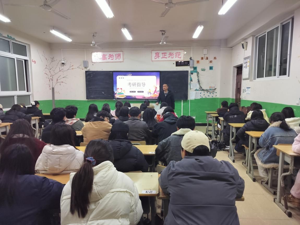 3月16日晚,联办本科美术学专业在一栋教学楼1503教室举办2027届学生考研动员指导会。美术教育专业副主任申肖飞作考研指导讲座,围绕院校选择、专业方向、报考政策、复习规划及时间管理等核心内容进行系统解读,提醒学生合理定位、科学择校。赵阳老师就备考常见困难及解决途径作详细分析。