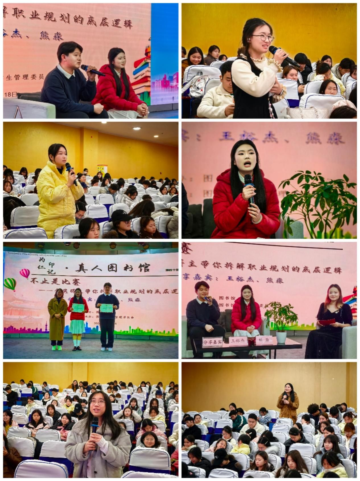 为深化第二课堂育人实效,丰富书香校园文化内涵,我校第四十期“真人图书馆”优秀案例分享活动近日在学术报告厅举行。本次活动以“不止是比赛——金奖得主带你拆解职业规划的底层逻辑”为主题,邀请学校职业规划大赛金奖得主学前2404班王裕杰与学前2509班熊淼担任嘉宾,与300余名师生共赴一场关于成长与规划的思想盛宴。