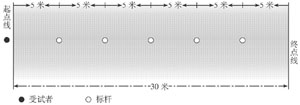 长度40米以上平整场地。测试距离30米,起点至第一杆距为5米,各杆间距5米,共设5根标志杆(杆高1.2米以上),设置如图2。