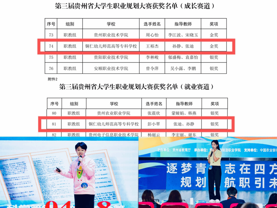 近日,由贵州省教育厅主办的第三届贵州省大学生职业规划大赛决赛(职教组)在贵阳举行。我校选派的学前教育系王裕杰获得成长赛道金奖,学前教育系彭小翠获得就业赛道银奖,实现了参赛项目100%获奖的优异成绩,充分展现了我校学子卓越的职业规划能力和学校高质量的人才培养成果。