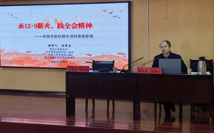 为深入学习贯彻党的二十届四中全会精神,传承一二·九运动薪火,厚植学校百年师范“为仁”文化底蕴,近日,我校关工委“五老”报告团面向不同群体开展专题宣讲。校党委原副书记、原校长、校关工委副主任冉贵生以“铜心向党传薪火 为仁躬行践初心”为题,面向“一站式”学生社区学生代表、学生干部开展宣讲。宣讲中,他结合一二·九运动的爱国传统和学校106年办学历程,深入解读党的二十届四中全会精神核心要义,阐释其与师范教育使命的内在关联。他结合自身参与学校建设的亲身经历,生动讲述了学校从思南师范讲习所到跻身武书连“中国师范类高职院校排名第一”的辉煌跨越,以及一代代幼专人践行“为仁”文化、投身幼教事业的担当故事,勉励学子们以史为鉴,将爱国情、强国志、报国行融入日常学习与未来职业规划,争做有理想、敢担当的新时代“为仁青年”。