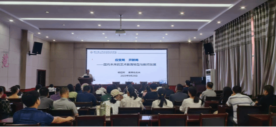 会上,杨廷树聚焦《应变局 开新局—面向未来的艺术教育转型与教师发展》主题,立足国家战略需求、区域经济发展和学校整体规划,从如何转型、如何整合融合、如何发展等方面讲解分析了艺术系专业建设、教师转型发展之路,深刻剖析了艺术系当前面临的形势与存在的核心问题。他强调,全系教师要从技能传授转向素养塑造、从单一学科转向交叉融合、从传统教学转向智慧创新转变。不断优化系内专业设置和课程体系,鼓励教师组建跨专业、跨领域的教学团队,共同开发综合性课程与项目。要在“危机中育新机,于变局中开新局”,以“主动求变”的姿态、“准确识变”的智慧、“科学应变”的能力,实现个人与系部的同步发展。