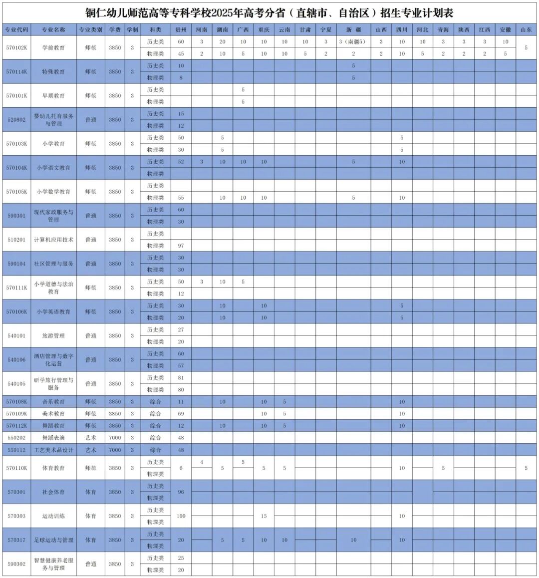 学校2025年高考分省(直辖市、自治区)招生专业计划如下(具体以贵州省教育厅下达为准,详见各省〈直辖市、自治区〉招生考试院公布的2025年高考高校招生专业目录。):