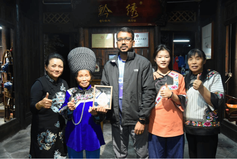 孟加拉国的UDDIN MD BORHAN带着自己的黔绣作品与非遗传承人合影